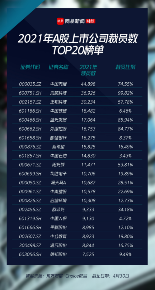 随着A股2021年年度业绩报告披露结束,上市公司裁员情况也揭开了面纱。上市公司在职员工数也是反映企业的经营情况好坏的一个指标,员工数量的减少往往意味着企业的开始收缩、 公司发展前景趋于悲观。