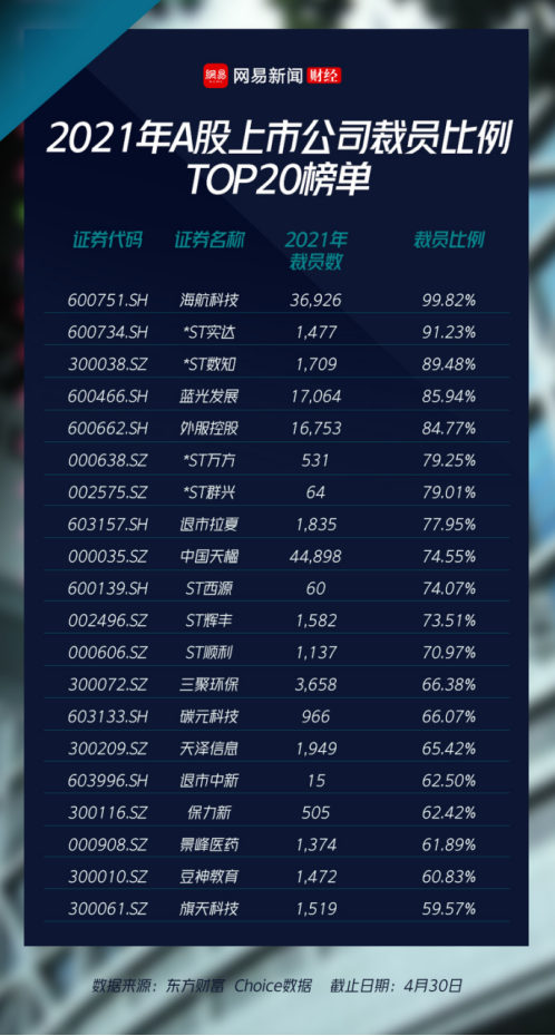 统计发现裁员比例在前20的上市公司中有ST贵人等7家ST公司,这些公司大部分普遍通过裁员等方式,希望扭转亏损局面,以免被退市。