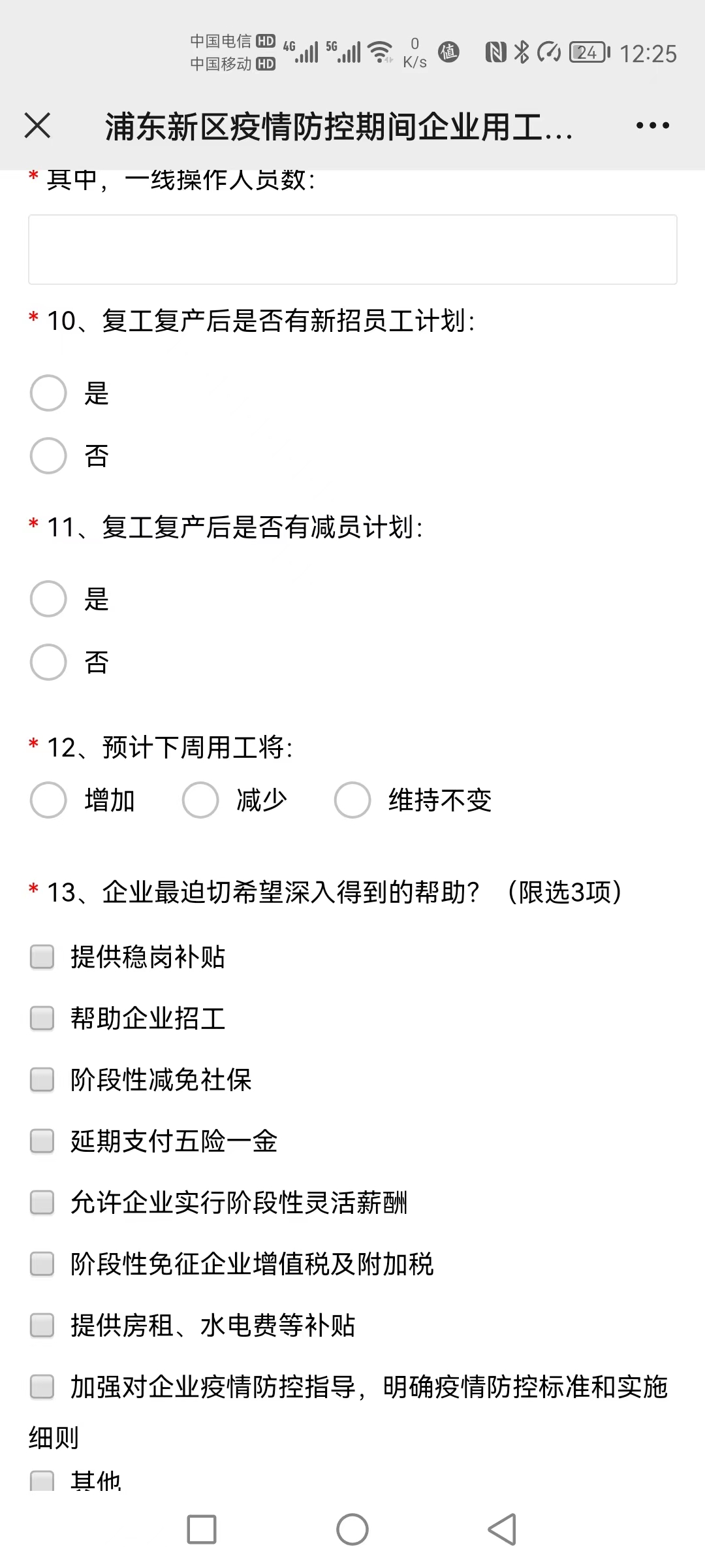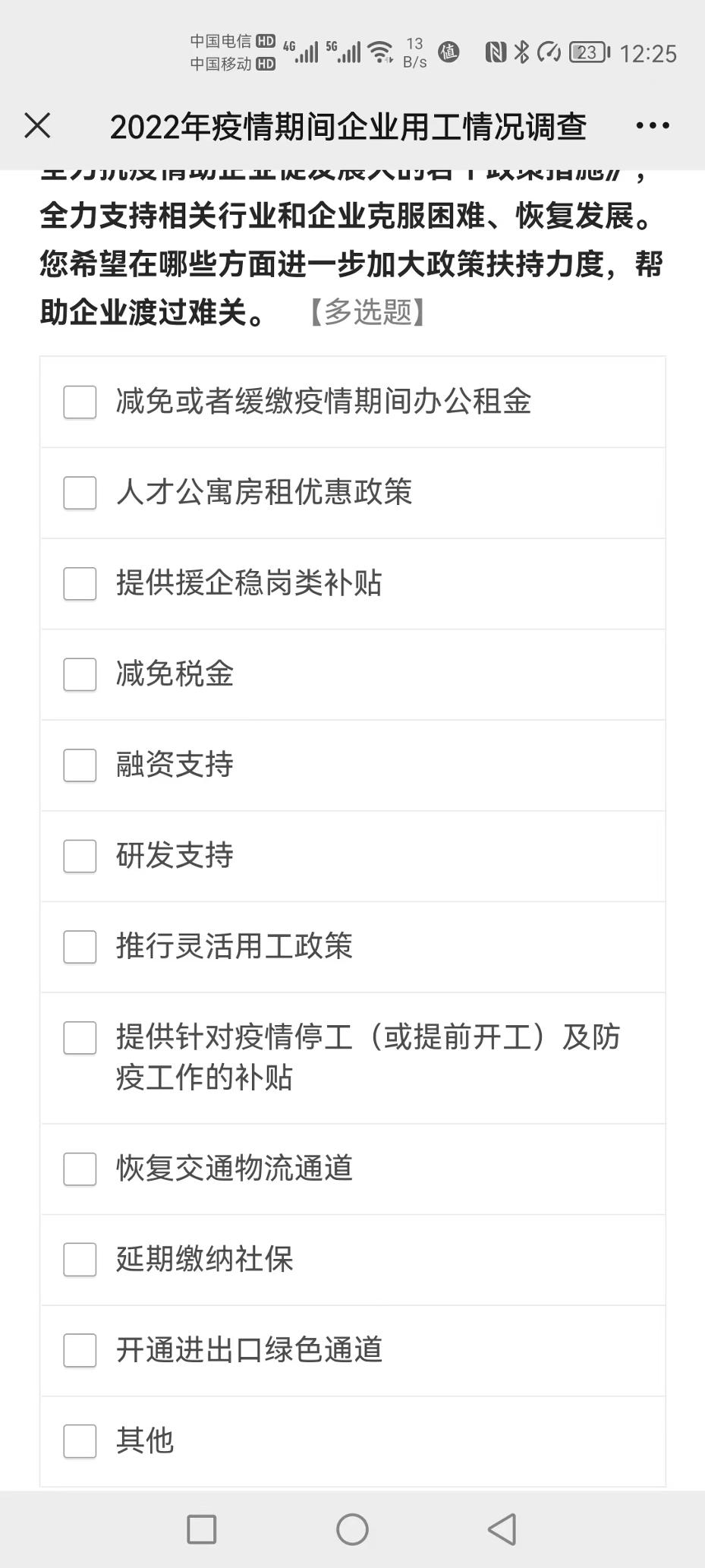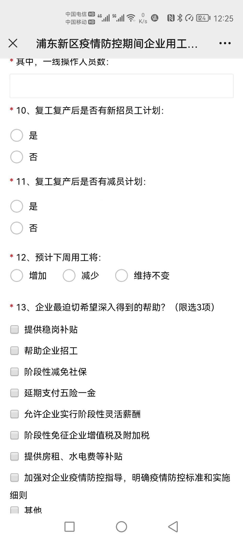通过比对,记者发现,这些问卷大体内容相同,其中主要包括“本轮疫情对企业造成的主要困难”、“企业是否降薪”、“企业是否启动裁员计划”、“希望在哪些方面进一步加大政策扶持力度”等。