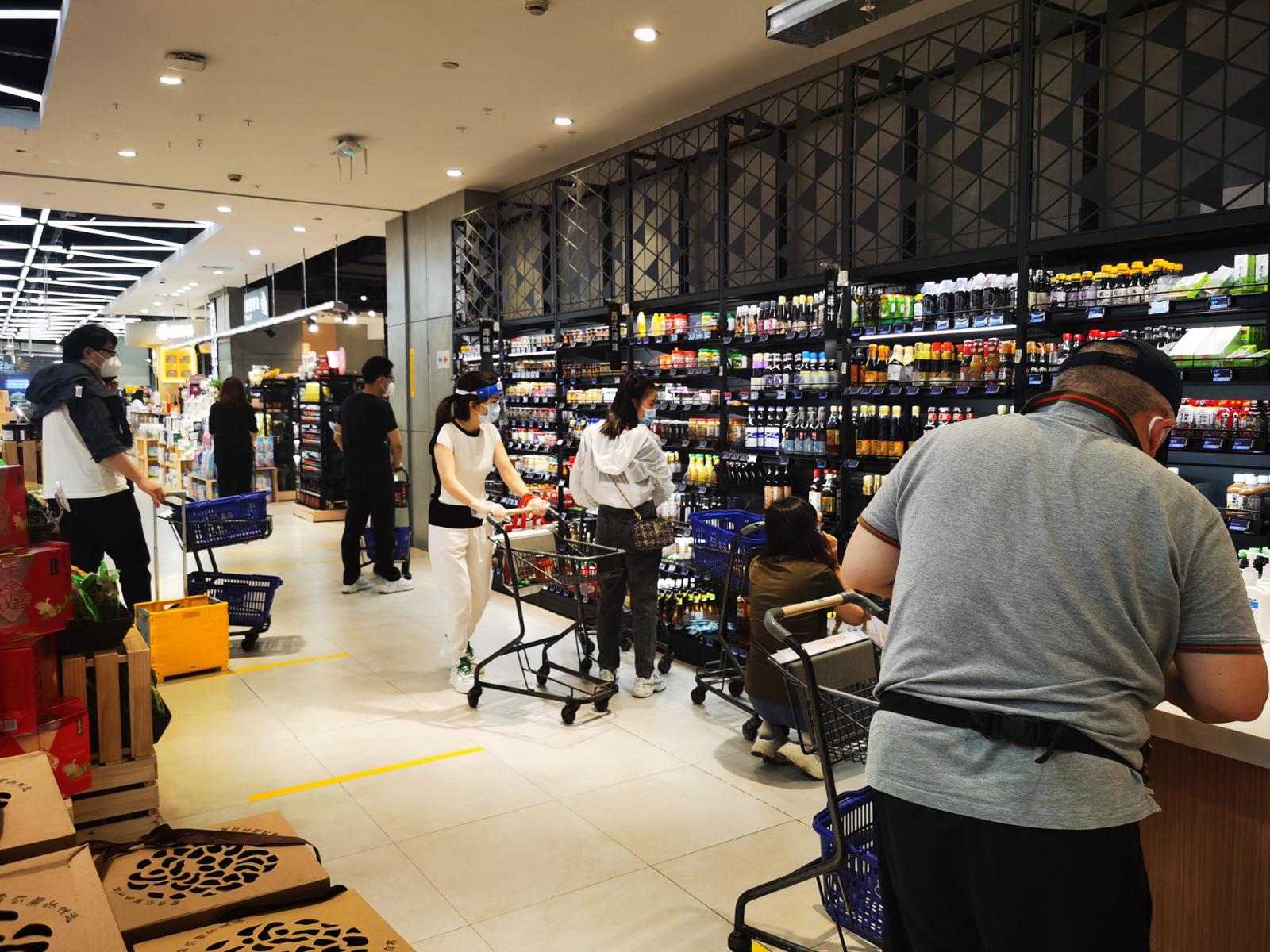 5月20日,盒马杨浦区新江湾城店已恢复线上营业,5月28恢复线下营业,能提供总共约1万个SKU的单品,目前可供应60%左右。张贴“场所码”、一天至少5次频率的消杀,以及源源不断的货品上架,门店正在恢复往日的供应力和活力。