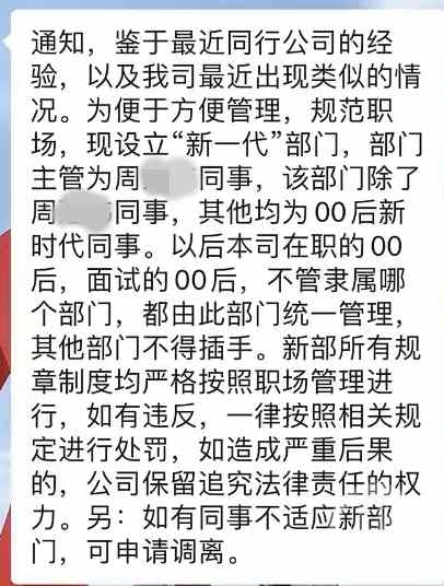 一位ID为“奥莱斯”的网友爆料贴出一张疑似公司发布的通知,通知称,鉴于同行公司经验,以及公司最近出现的类似情况,为便于管理,规范职场,现设立“新一代”部门。