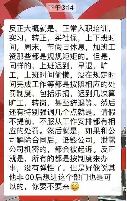 与此同时,对于上班迟到、早退、上班偷懒、没在规定时间完成工作等情况设置了相应的处罚制度,对迟到几次算旷工,哪些情况将被转岗甚至辞退等情况进行了规范。新部门特别强调:请假不提前、不服从工作安排都有相应的处罚。如果与公司解除合同,诋毁公司、泄露公司机密都会被追究法律责任。总而言之,新部门的宗旨是要给00后员工强调制度,并按制度来办事,弹性变小了。