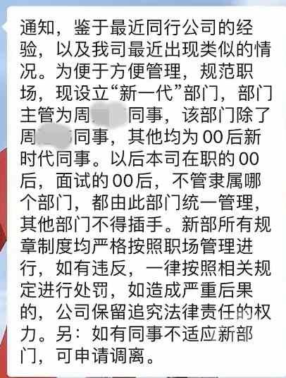 据悉,该部门主管为一位周姓负责人,除他之外该部门员工均为“00后新时代同事”。此后,该公司在职及入职的00后,不管隶属于哪个部门,都由此部门统一管理,其他部门不得插手。新部门所有规章制度均按照职场管理进行,如有违反,一律按照相关规定进行处罚。如果不适应新部门,可申请调离。