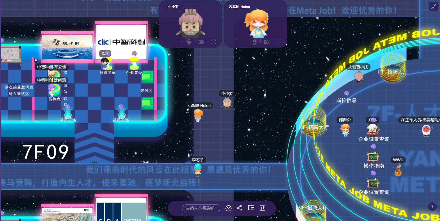 利用“虚拟环境”加上“实时互动”,元宇宙招聘大厅从创意到落地,只用了一周的时间。场景将高度模拟线下招聘会现场,招聘大厅的信息板块接入了数据分析平台,应聘者只要点击“信息板”就能看到整场活动数据,筛选出自己需要的信息定向了解企业信息与岗位要求,快速定位与自身的匹配度。每家企业也都有自己的专属展位和品牌标识,展位中设有面试区和等候区,展位前方的可交互物中有企业介绍、企业视频、简历投递、二维码等资料,走进即可打开查看信息。企业也将安排HR人员在线与应聘学生进行互动,“面对面”应聘。还可以走进“小房间”,接受单人职业指导。