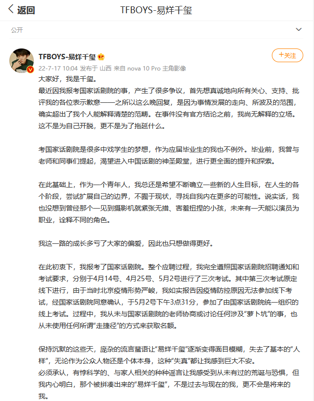 7月17日,易烊千玺在个人微博发布声明,就报考国家话剧院一事进行回应。