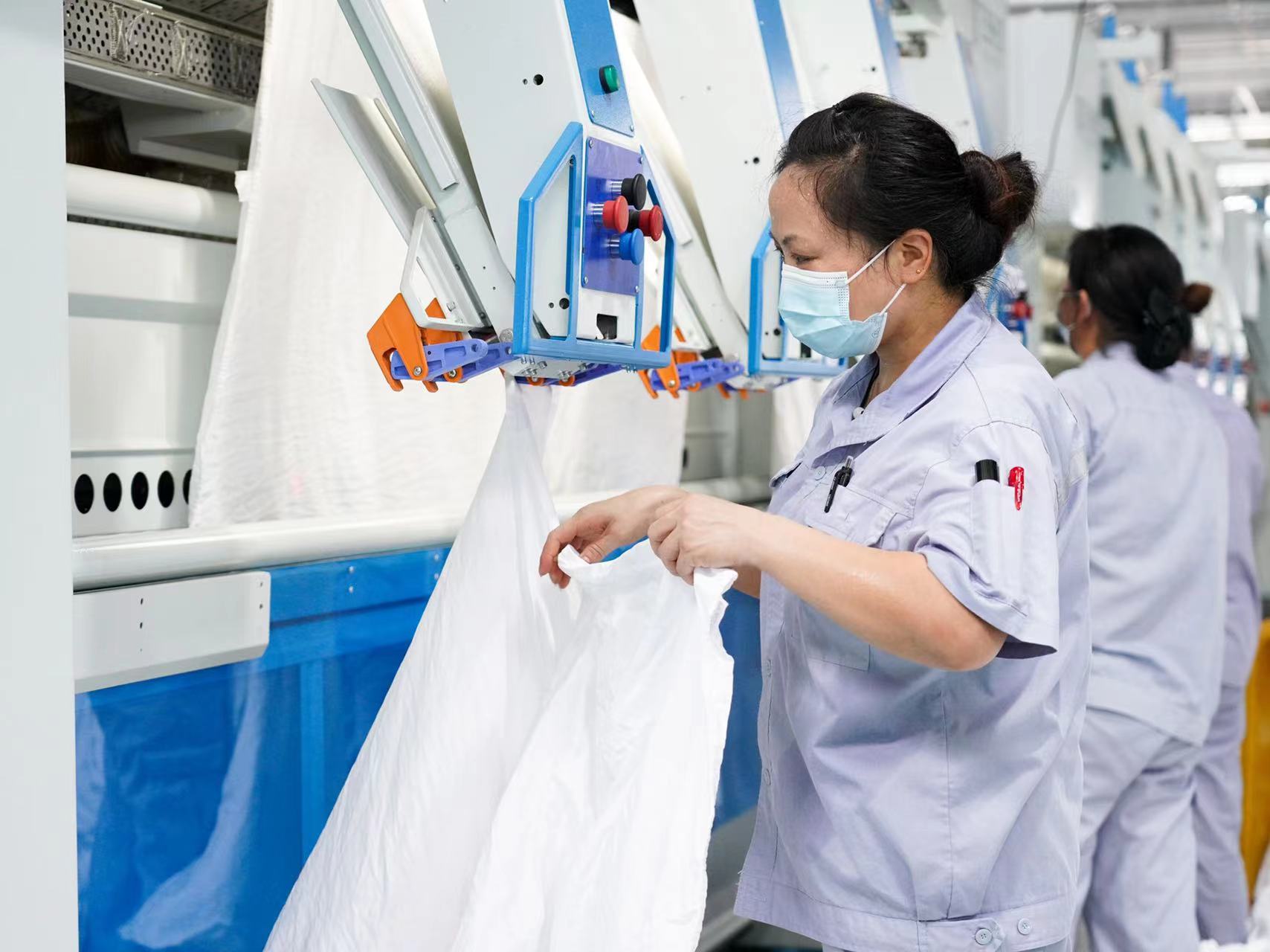 每次熨平作业后,金梅华和同事们还要复检一遍。一天下来,从熨平机到后台,身上湿了干、干了再湿。记者跟了近半个小时,人已经像从水里捞上来的一样。金梅华介绍,她和工友平均每天“补水”4公斤左右,基本是常人摄入量的1倍还多。