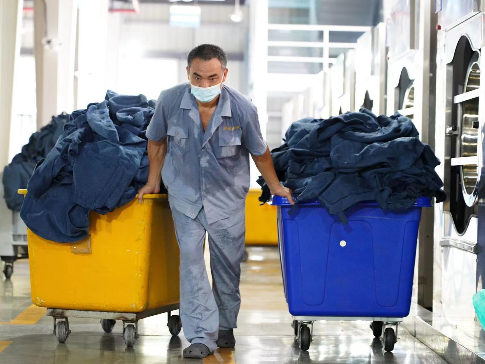 “物件消毒和洗前预检是布草清洗的头两道工序。”陈士连说,自己主要负责消毒、清洗、烘干这一系列洗涤工序。“白色布草通过消毒、预检后可以投放到全自动隧道式洗涤龙内,而其他颜色的就必须人工投放到这些大型洗涤机里”,为了避免交叉染色和起皱,陈士连熟练地将布草进行分拣,眼手配合,不到5分钟,一整桶50公斤布草就投放完成,此时,陈士连的脸上和工作服上已有了大片汗渍。