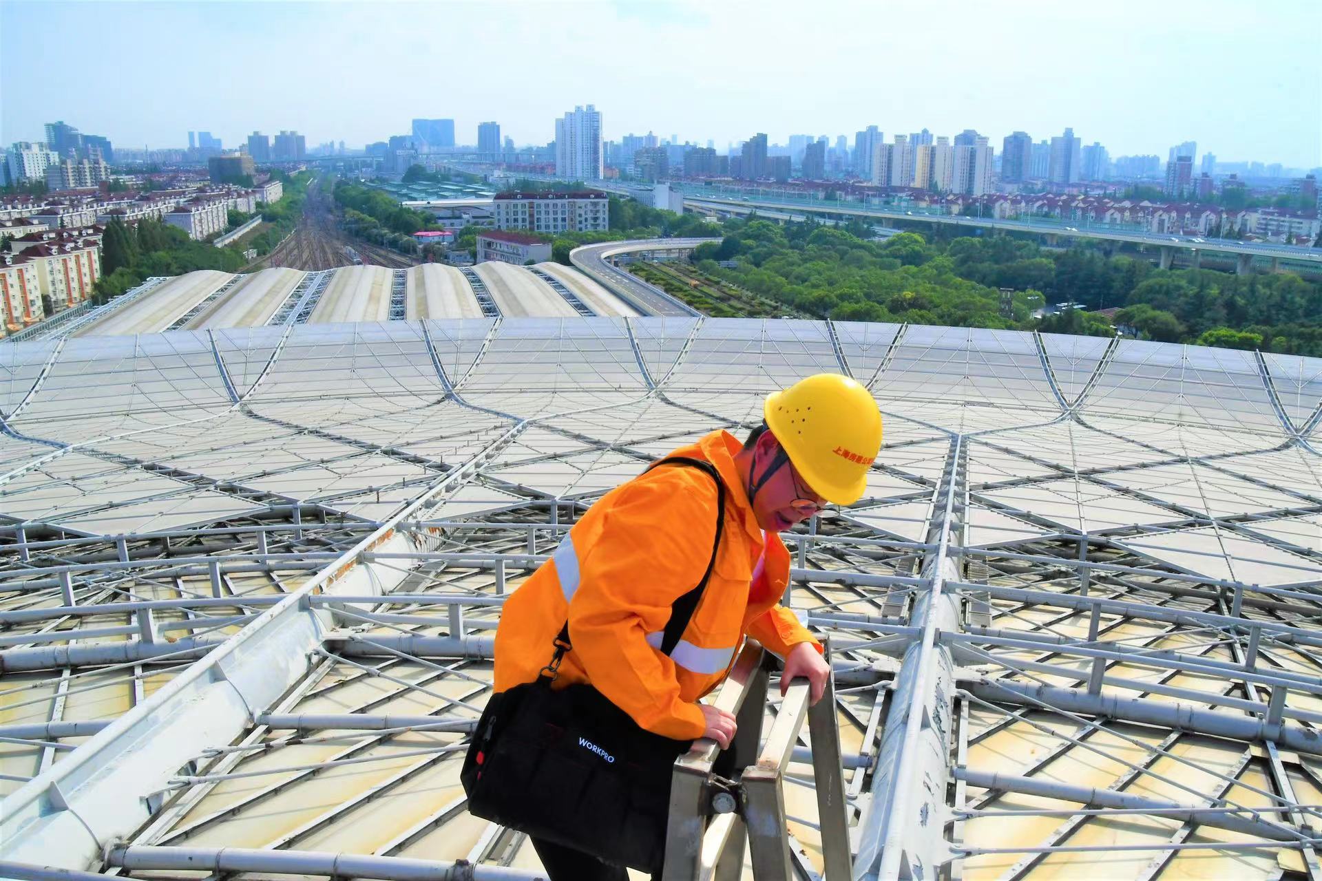 临近下午3点,烈日炙烤大地,上海房建公寓段房建巡检工郭恒泰带着工区的小伙伴们背着工具包爬过狭窄的钢梯,踏着陡峭的铝合金遮阳板,一路走到了47米高的上海南站站房屋顶。他们将要进行的是暑运期间的房建设备巡检工作。