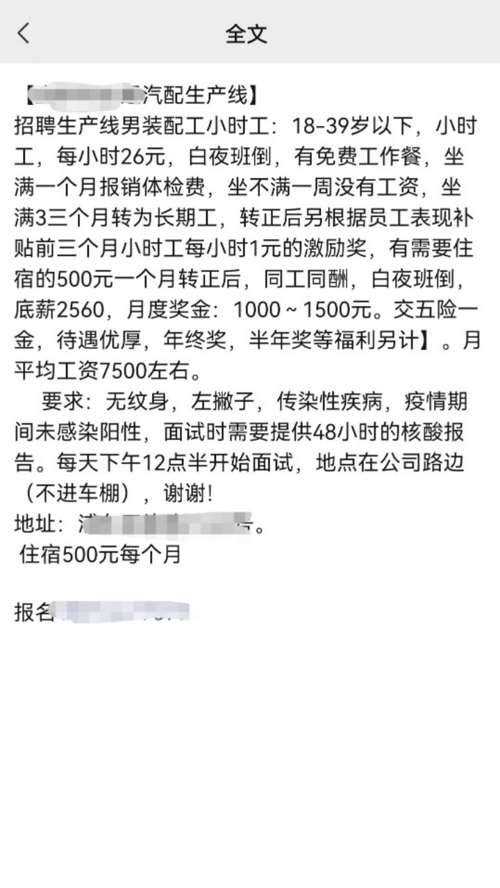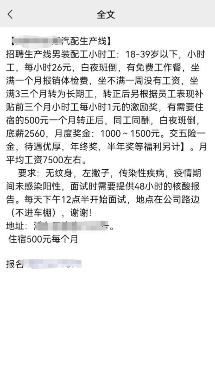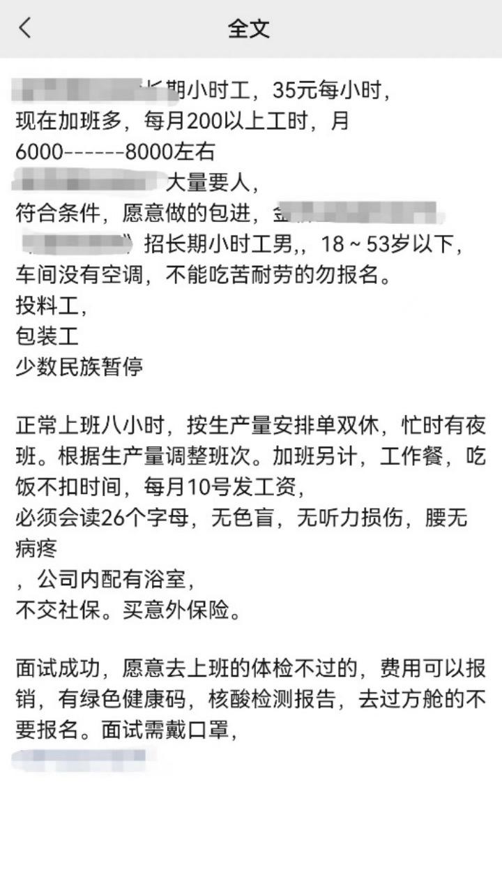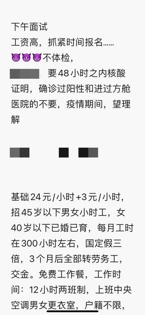 此外,在这位中介当天朋友圈发布的招工信息中,也提及两家工厂“疫情期间未感染阳性”“去过方舱的不要报名”的招工条件。