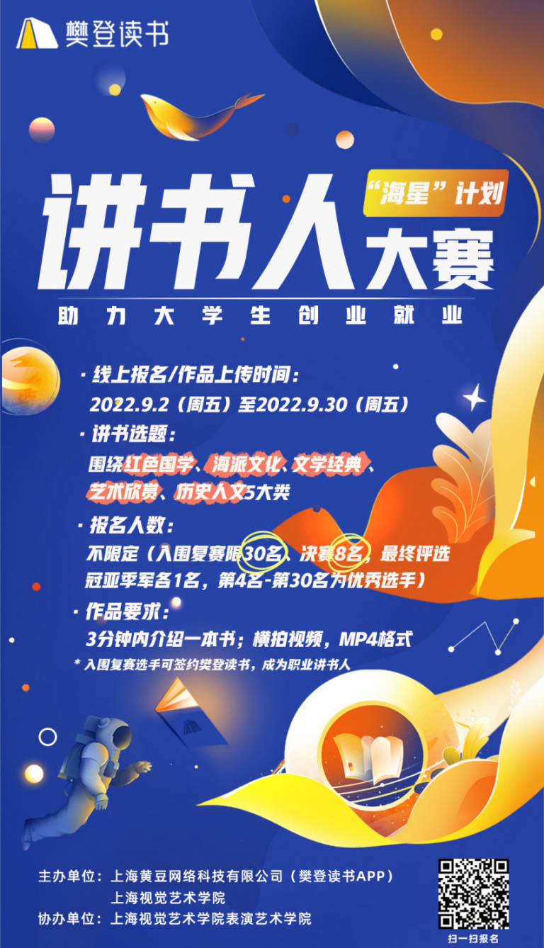 根据《“十四五”职业技能培训规划》,开展大规模职业技能培训,是提升劳动者就业创业能力、缓解结构性就业矛盾、促进扩大就业的重要举措,是推动高质量发展的重要支撑。日前,由上海视觉艺术学院和樊登读书APP联合举办的樊登读书“海星”计划——讲书人技能大赛正式启动。