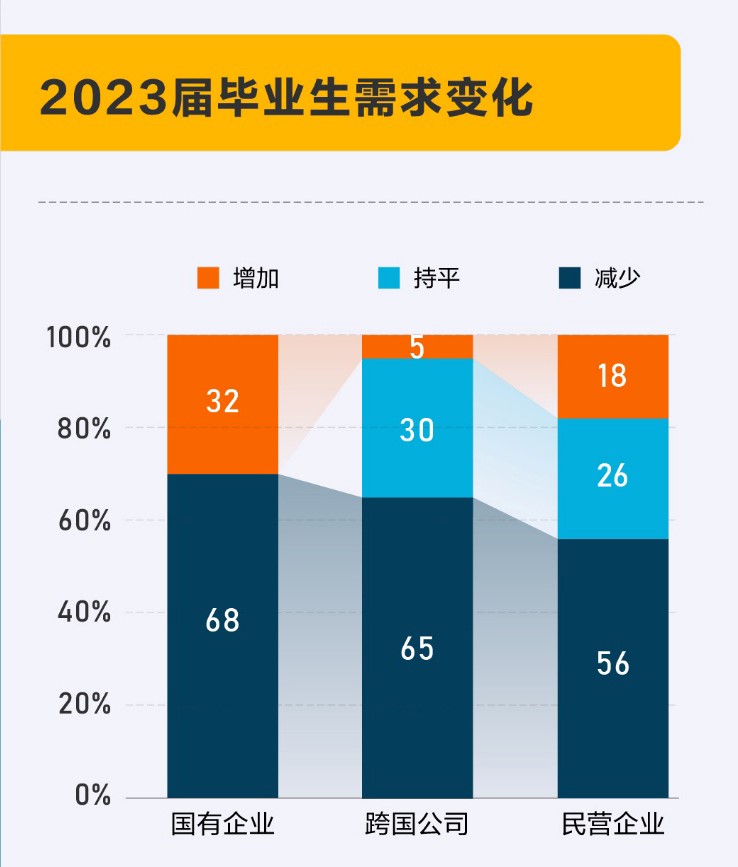 58%的受访企业表示“2023届毕业生的招聘量将少于2022年”,其中,68%的国有企业表示会减少,同时32%的国企称“将增加招聘”,而2022届毕业生招聘量增长最多也来自国有企业。