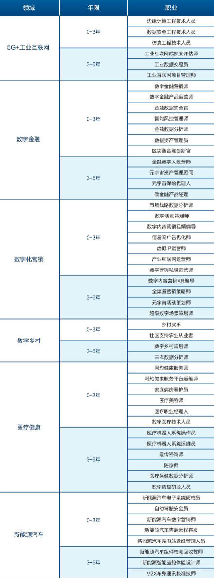 未来职业是指随着科技发展、经济社会需求变化,以及组织和商业模式的变化,进而出现的一类新的、个人用来服务于社会并将其作为主要生活来源的就业和工作形态。当下数字转型、绿色转型和社会转型正在推动生产模式、工作模式和生活模式的深层变革,使未来职业的就业形态更加多样。此次发布的52个未来职业“高清画像”,涉及涵盖医疗健康、5G+工业互联网、数字化营销、数字金融、数字乡村、新能源汽车等六大领域,依据发展成熟度分为0-3年与3-6年两个阶段,既可以看到新技术、新业态和新模式场景下,原有职业内涵发生变化的更新性职业,也可以看到全新职业类型,不仅明确了职业定义,细化了主要工作任务,更进一步列出了具体技能要求清单。