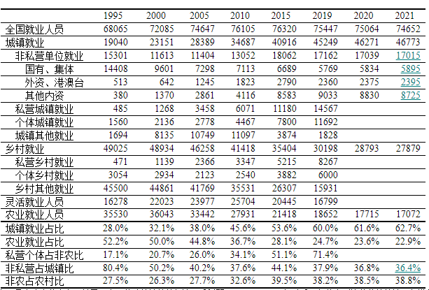 表1 | 中国就业市场结构(1995-2021)。数据来源:中国统计年鉴。单位:万人,部分区域空白因未公布。城镇其他就业指家庭帮工、自由职业等,乡村其他就业主要是家庭农业生产。关于三合一劳动统计的特征请见岳希明(2005)。1995年以后,部分类型就业数的统计口径进行了调整,并不完全可比。
