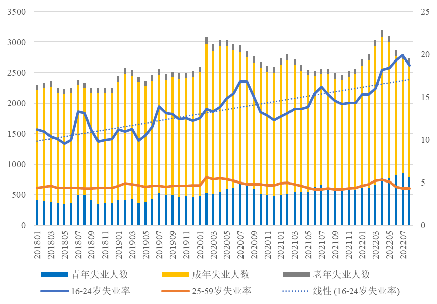 就业是民生之本,就业是宏观经济最重要的目标,稳增长主要是为了稳就业。2022年年初以来,受疫情等因素影响,就业形势承压。6-10月,中国16-24岁的城镇青年调查失业率持续居高不下,在17.9%-19.9%之间。