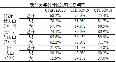 表2从多个数据源计算了不同年龄段的劳动参与率,数据显示CHFS和CFPS的数据相对一致,与ILO的数据也比较接近,基于这两份数据,我们可以发现以下现象: