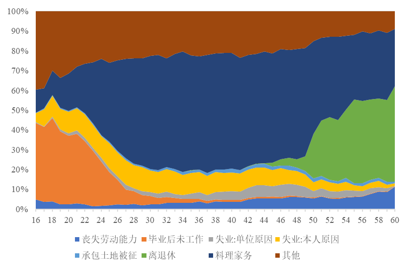 25-59岁人口,最大的未工作因素是料理家务,占到近五成因素,其次是离退休,占14%(这两部分人群主要是女性);再次是因单位、个人或征地导致的失业或退出劳动力市场,占到12%。