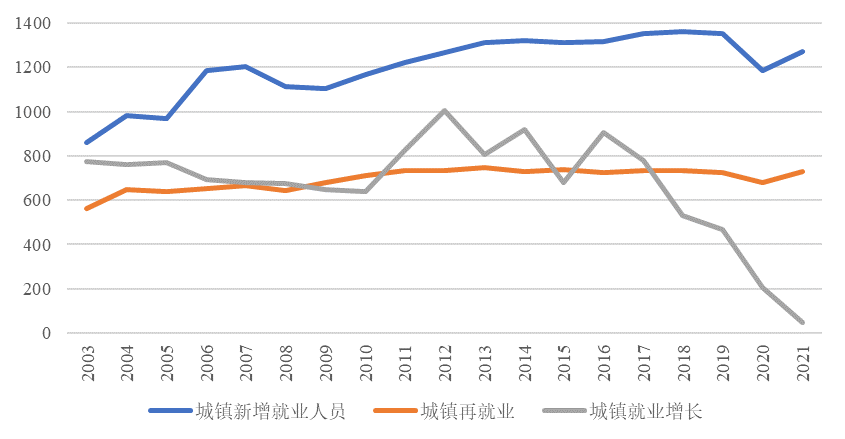 2010年以后,人社部公布的新增城镇就业规模一直在1300万人以上,如图3所示,每年的新增就业里有半数以上是失业和就业困难人群的再就业,扣除以后,有600万以上就业增量。2017年以前,每年城镇就业人员增长也在600-1000万,虽有出入,但大体对得上。