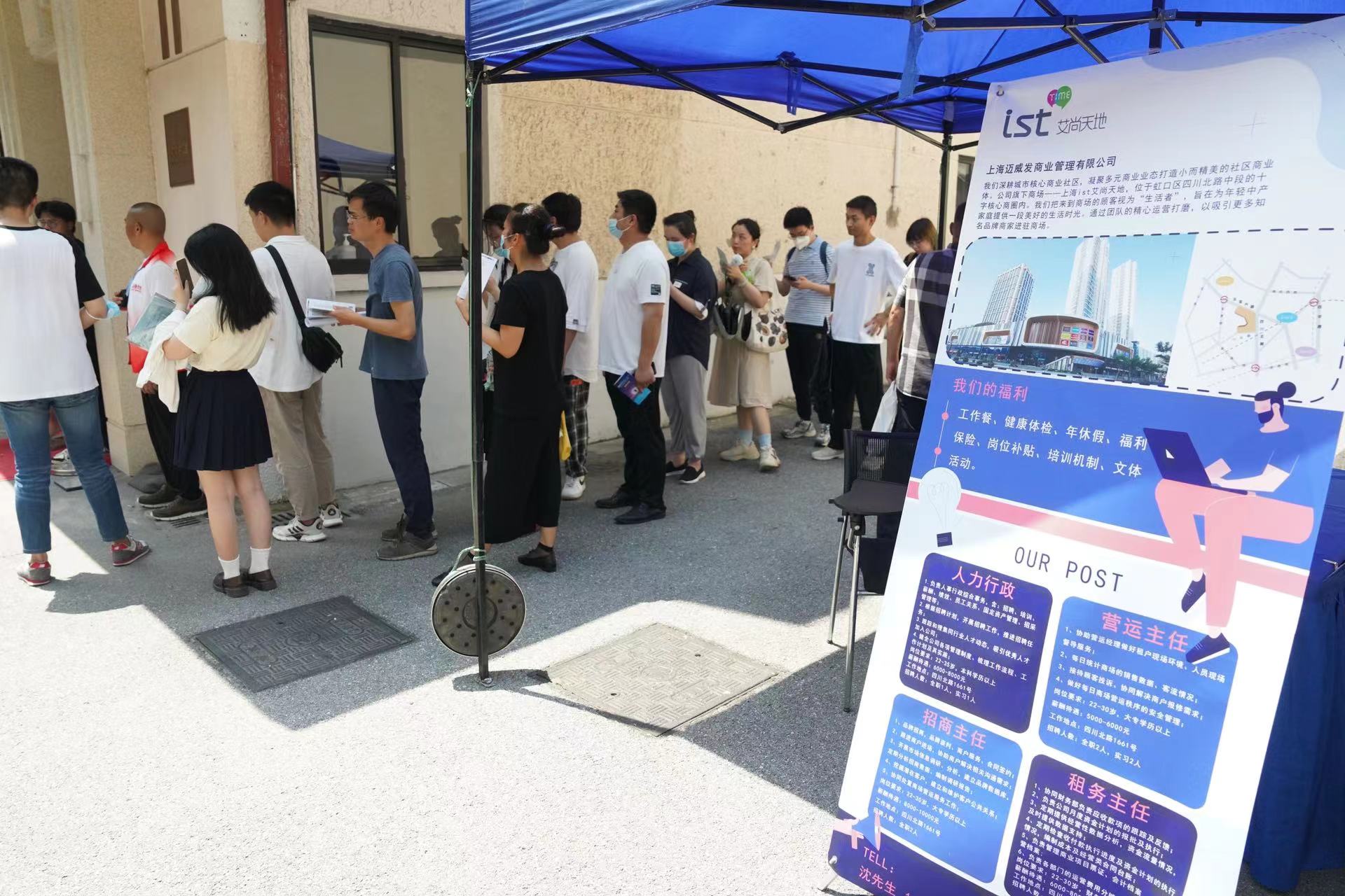 比高温天更火热的是招聘会现场。6月28日,2023上海社会组织联合招聘线下专场招聘会在上海公益新天地园举行。应聘者在烈日下排队应聘,社会组织岗位的稳定性吸引了大量求职者。