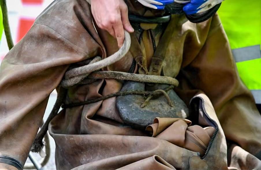 下井前必须套上30多斤重的铅块。劳动报记者 颜筱依 摄影