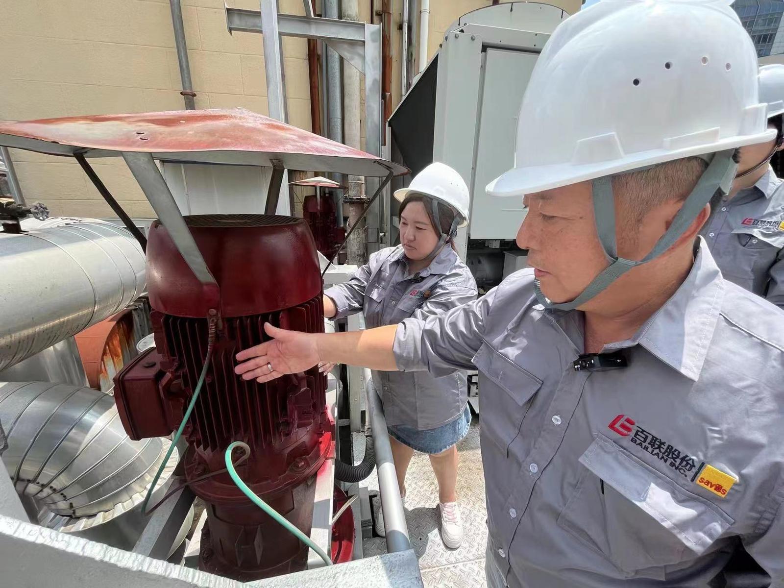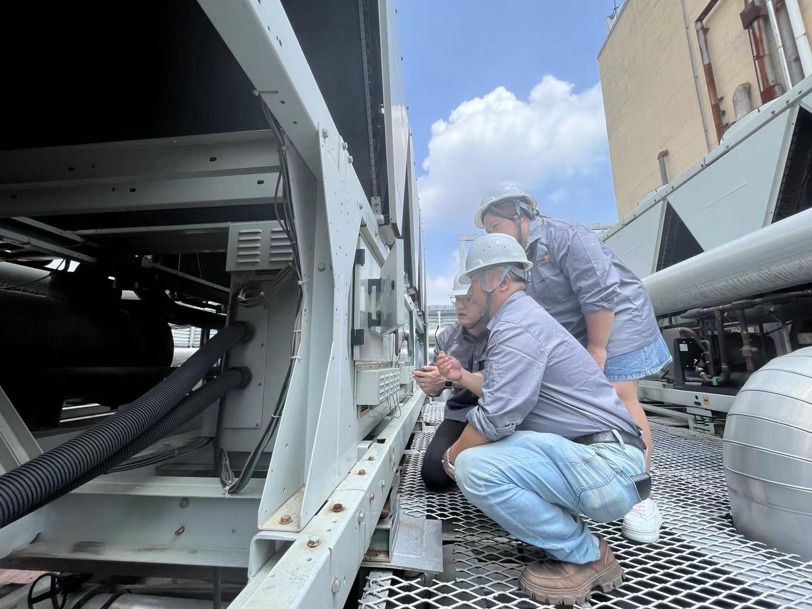 “炎炎夏日,商场单层经营面积大,对制冷的要求很高。需同时启用热泵、冷水两套系统。其中,商场B1至4楼,由B2层地下车库中的冷水机组来保障供冷,而商场5楼至8楼则由9楼露台的热泵机组来保障供冷。”沈杰介绍,“维保师的岗位主要是维护和保养,我们通过每一天的日常巡检,来完成维保任务。”