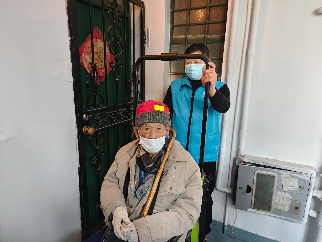 成功帮助老人完成“爬楼”。劳动报记者陆燕婷 摄影