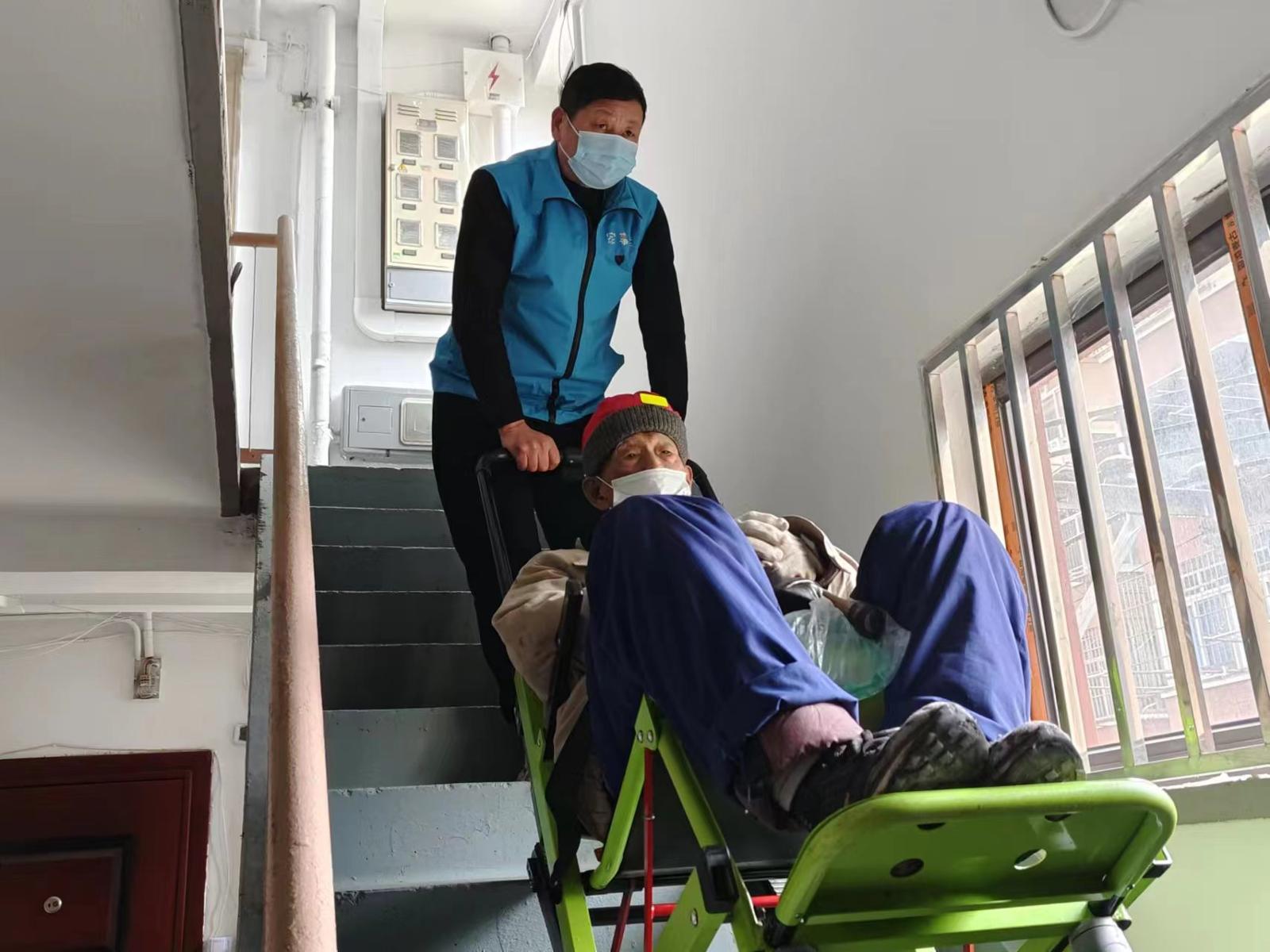 现场,91周岁的孟志钦老人刚刚从附近的曲阳医院做完血透回到社区。因身患尿毒症,他每周二、四、六都要到医院进行血透,他也是曲阳医院血透病人中年龄最大的老人之一。但每每从医院回到社区,身体虚弱的老人如何爬上楼梯回到其位于三楼的家中,成了极大的难题。而陈宗良的工作,就是帮助如孟志钦老人的人群,实现“躺平式爬楼”。