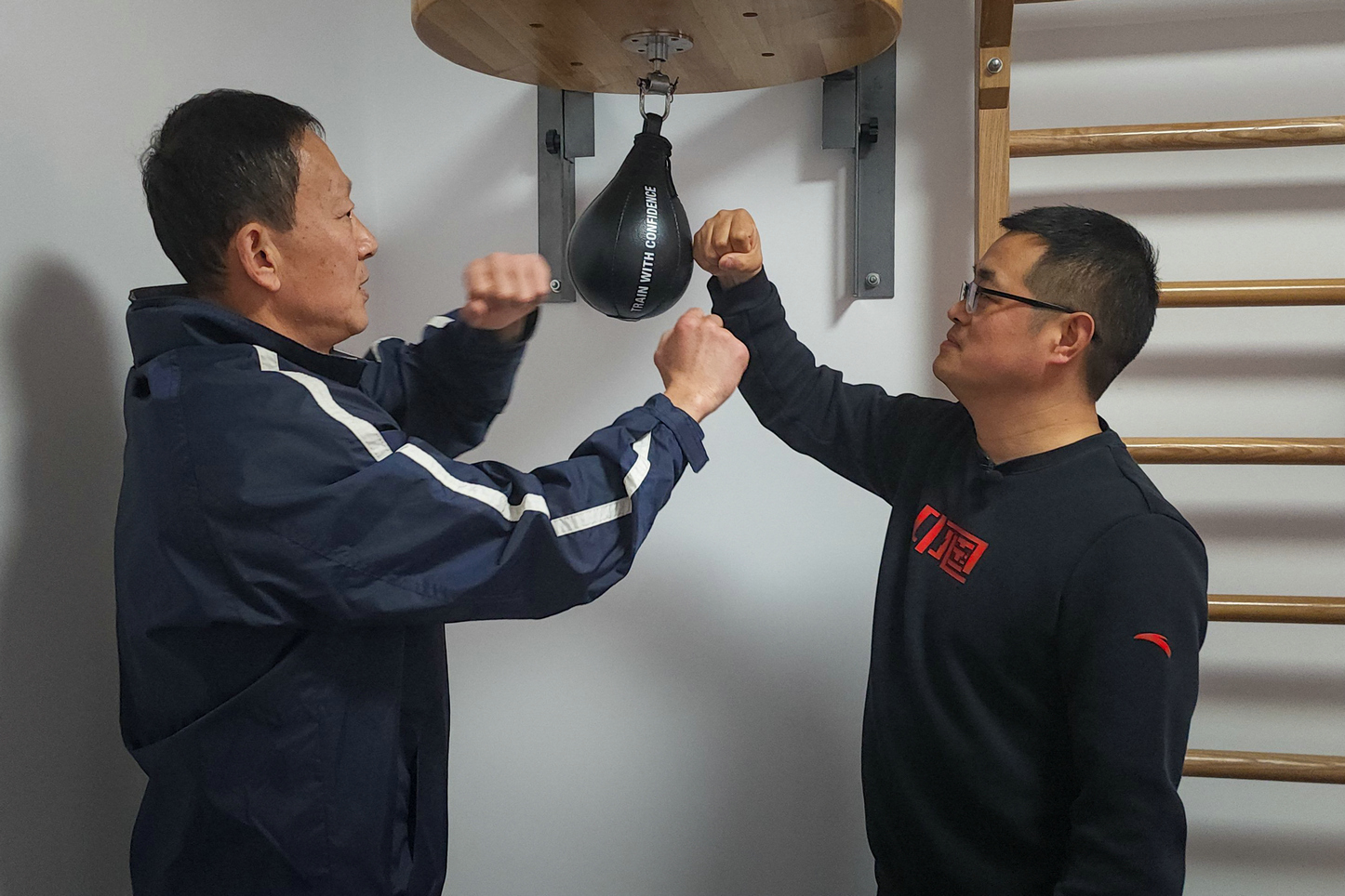 什么是进攻架势,如何进行防御,怎样蹬转发力……王教授一上来就直接切入正题,向记者灌输了一连串的拳击技术动作。尝试打了几套基本动作后,记者一咬牙,决定与师父挥拳实战。