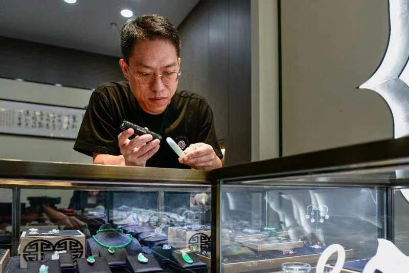 头图为翡翠行业资深从业者鲍杨益。劳动报记者颜筱依 摄影