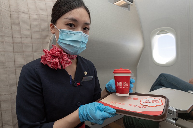 东航C919乘务长刘海绮正在机舱内为旅客提供服务。东航供图