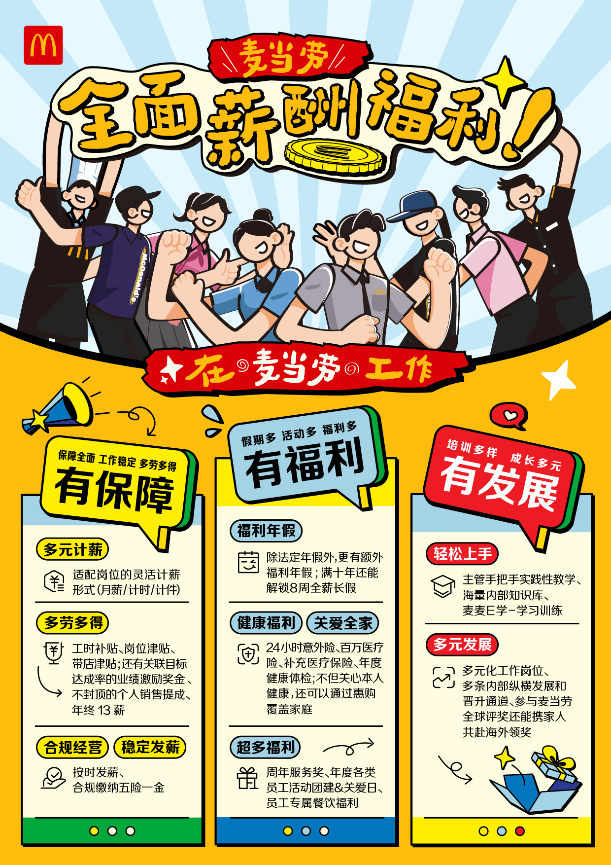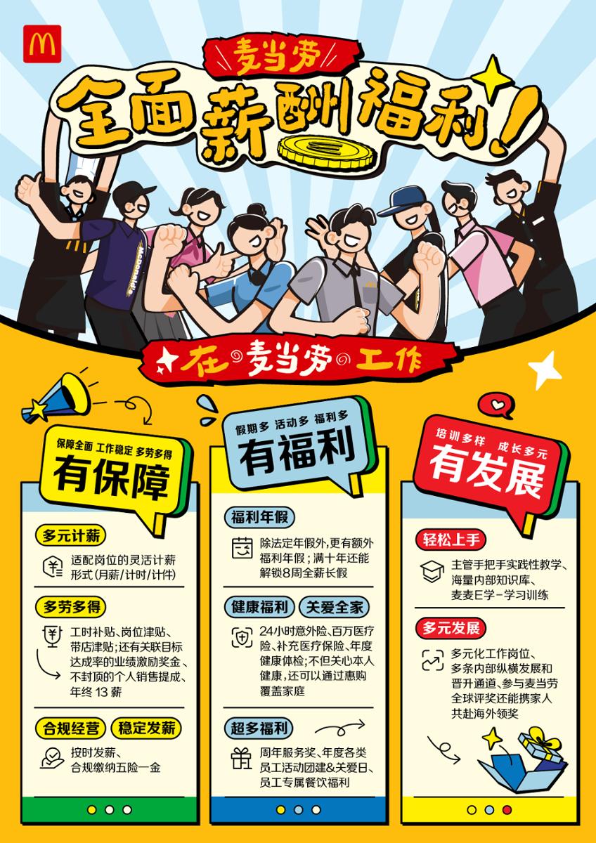 有保障:即多元计薪、工作稳定、多劳多得,薪酬有保障。麦当劳为餐厅不同岗位定制了不同的薪酬体系,提供包括月薪、计时、计件等多元化计薪方式,叠加工时补贴、岗位津贴、带店津贴等多重激励,还设置了业绩奖金、无上限的销售提成和年终13薪,为员工全额缴纳五险一金。