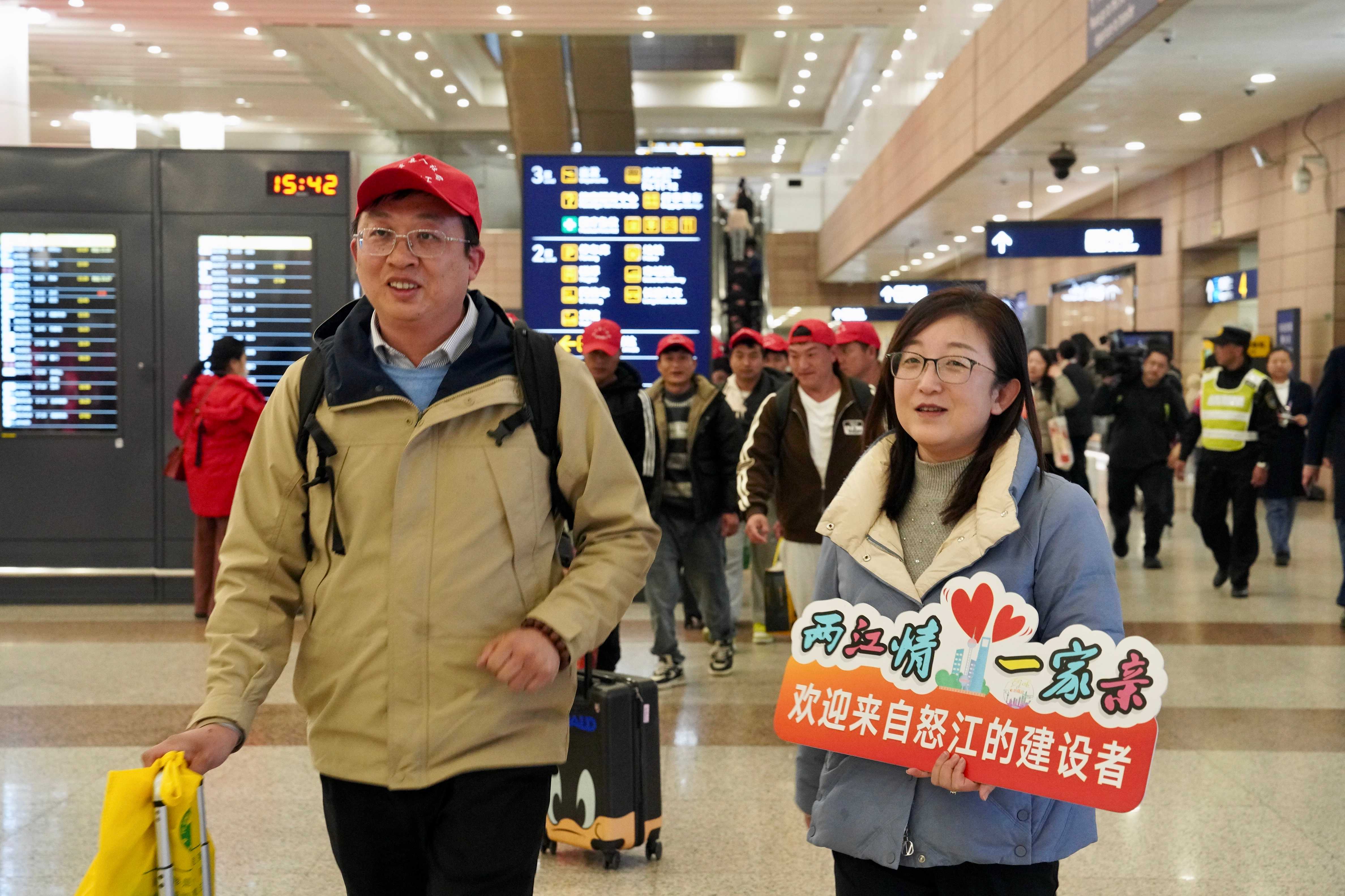 1月4日下午,浦东新区2025年首批“点对点”东西部劳务协作成批转移人员抵沪,32名来自怒江州福贡县的务工人员到达浦东,将进入京东物流、清美、多多买菜等企业工作,这也拉开了全市稳岗留工送温暖活动的序幕。