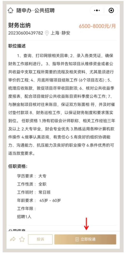 STEP3:选择职位点击进入,可看到该职位具体信息。在职位信息页面下方点击“立即投递”,即可成功投递简历。