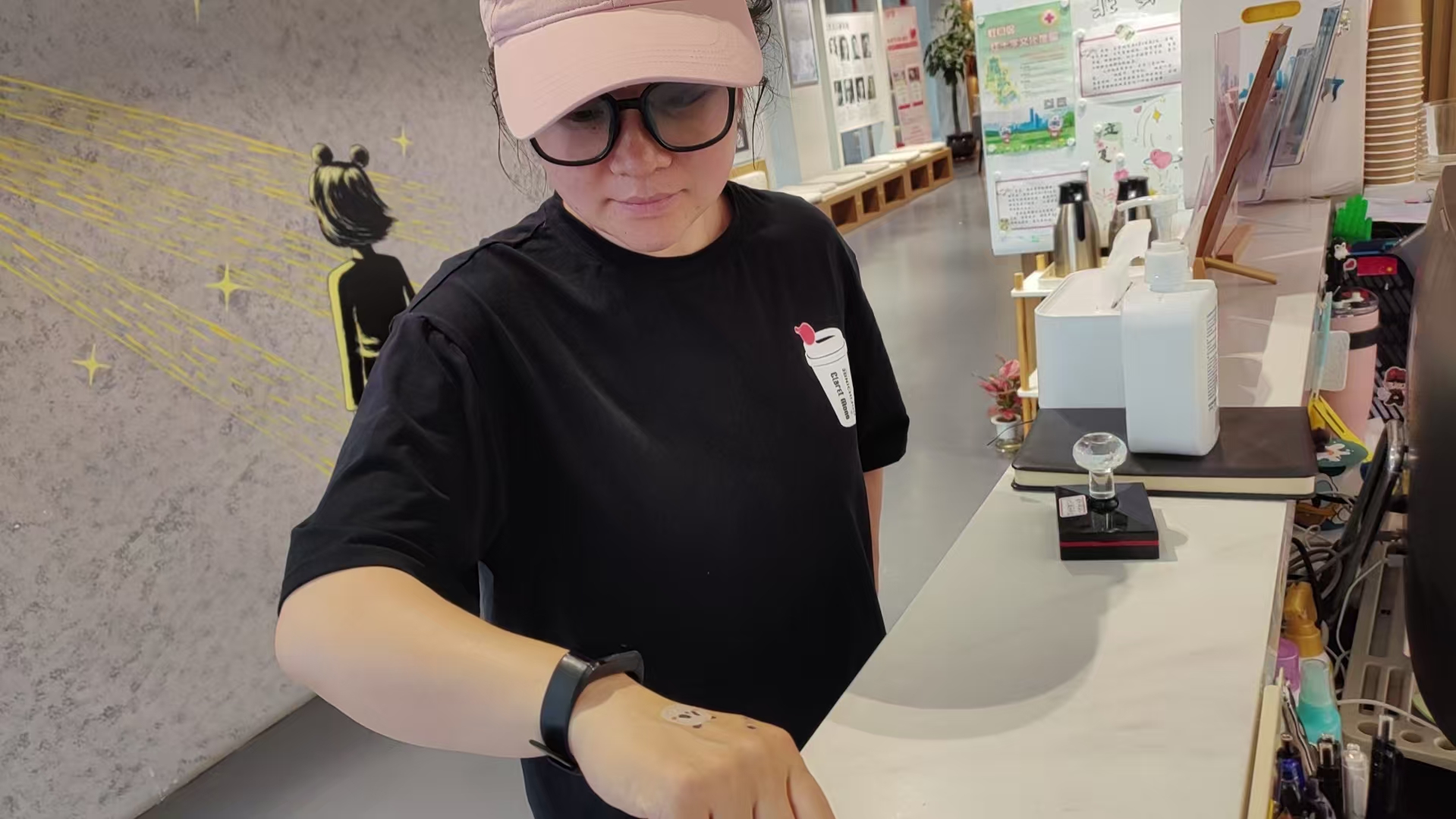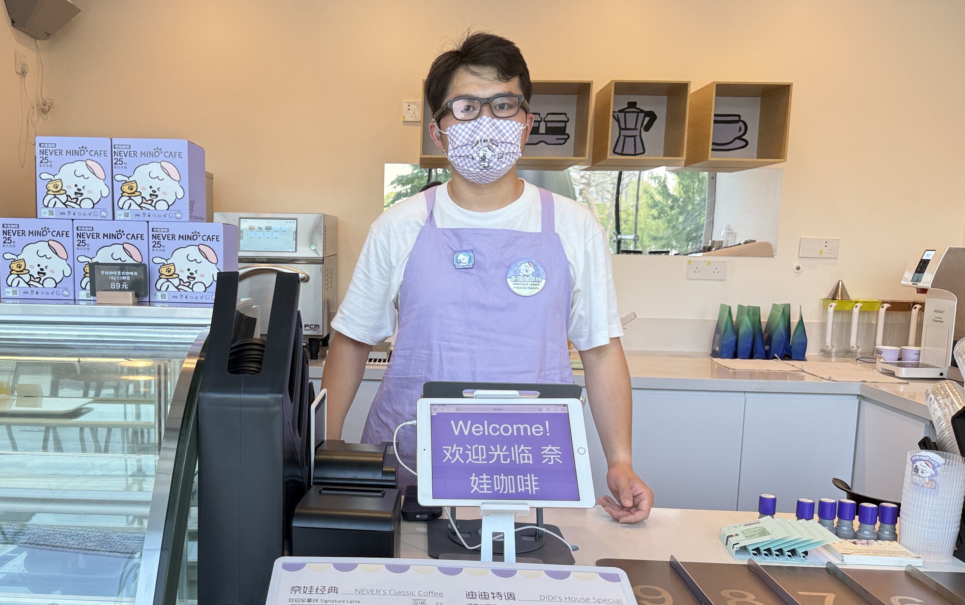 在熊爪咖啡与奈娃家族IP共同开出的咖啡店内,听障咖啡师戴上了新款AR眼镜。受访者供图