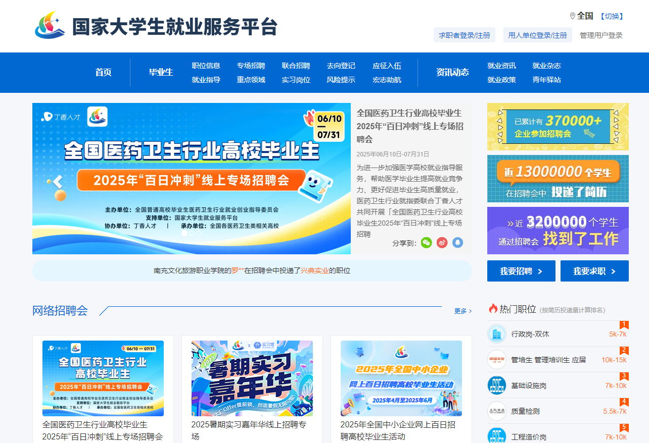 另外,毕业生还可以查看专场招聘会的信息,包括网络招聘会和各地举行的线下招聘会。仅在5月份,平台就上新了8万余个岗位。目前,还有多场专项网络招聘会正在进行中,比如,“职”在科研“就”有未来2025年科研助理招聘活动、全国医药卫生行业高校毕业生2025年“百日冲刺”线上专场招聘会、工业和信息化部和教育部主办的2025年全国中小企业网上百日招聘高校毕业生活动等。