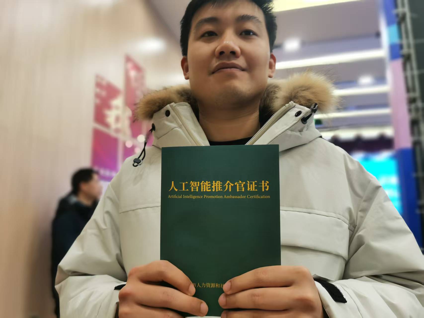 头图为汪天成高兴地拿着“人工智能推介官”证书。劳动报记者 罗菁摄影