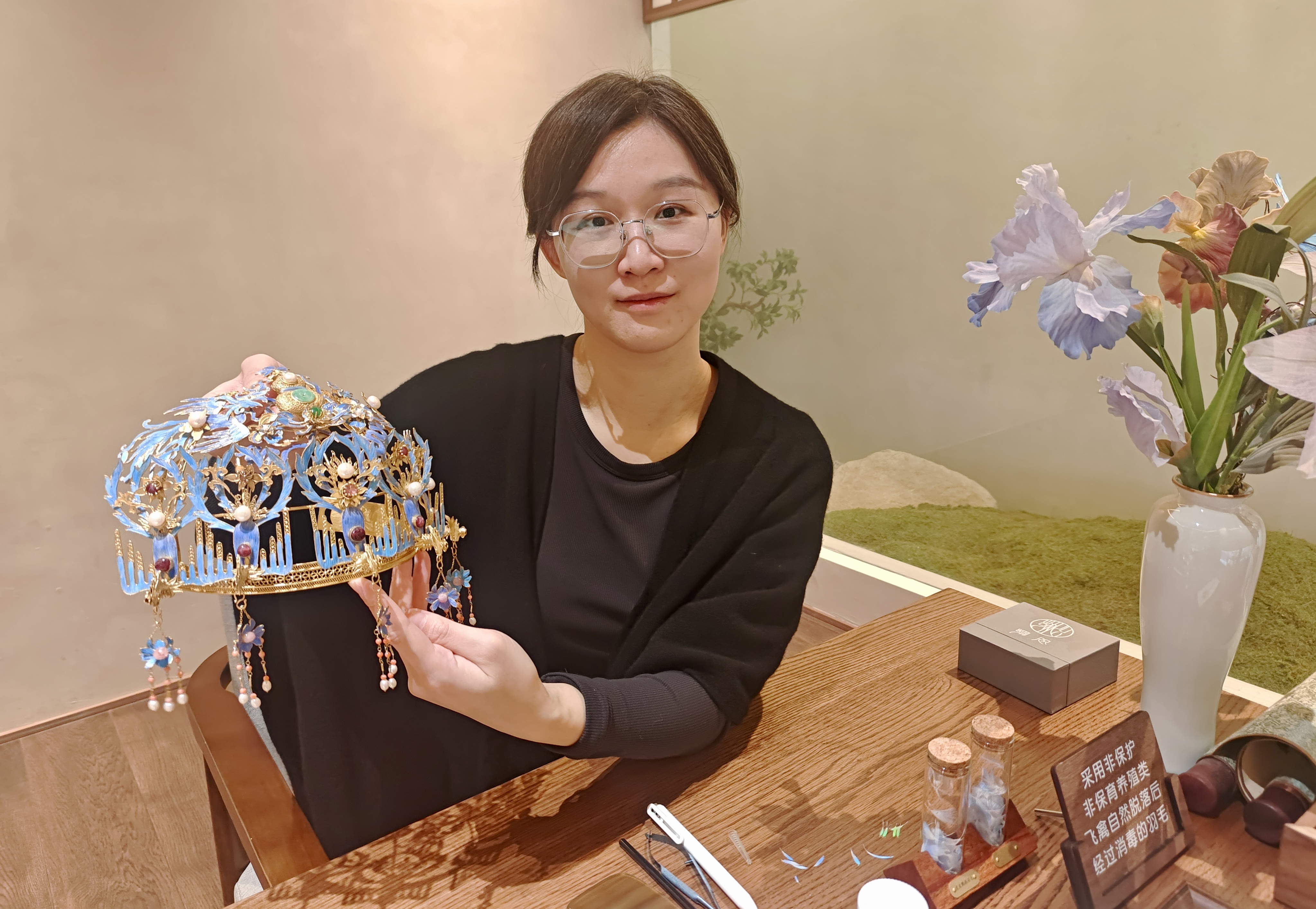 “当年婚礼上的凤冠,我设计图纸之后,我和先生进行手工打版,再由我进行羽毛镶嵌,整个过程纯手工制作完成。”如今,沈佳琪所亲手制作的饰品中,小件的耳饰、吊坠,中件的发钗,到大件的凤冠,皆经传统技艺纯手工打磨,一丝一缕尽显匠心与创意。