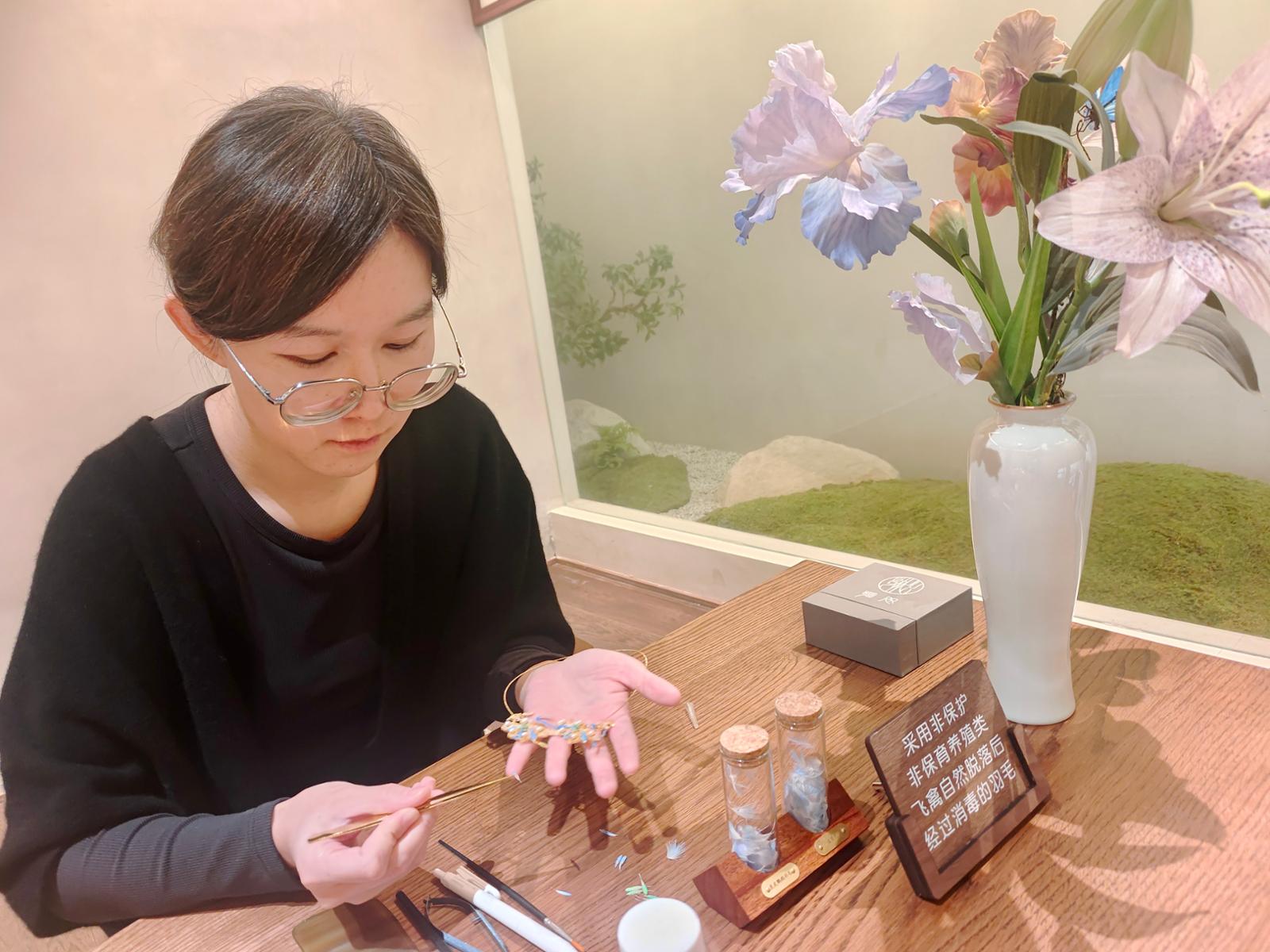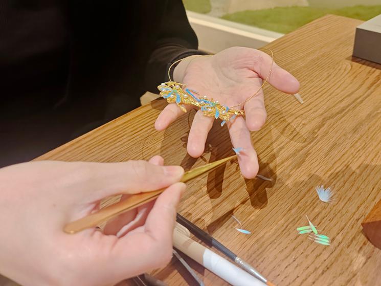 细小的羽毛经轻轻梳理粘合,以指尖的力量镶嵌在金银丝线勾勒的图案中,成为独具匠心的饰品。奉贤区羽毛镶嵌非遗技艺代表性传承人沈佳琪将爱好变为事业,并将这项融合传统点翠和羽毛贴画的“绝技”发挥淋漓,更将传统技艺与时尚潮流完美融合。