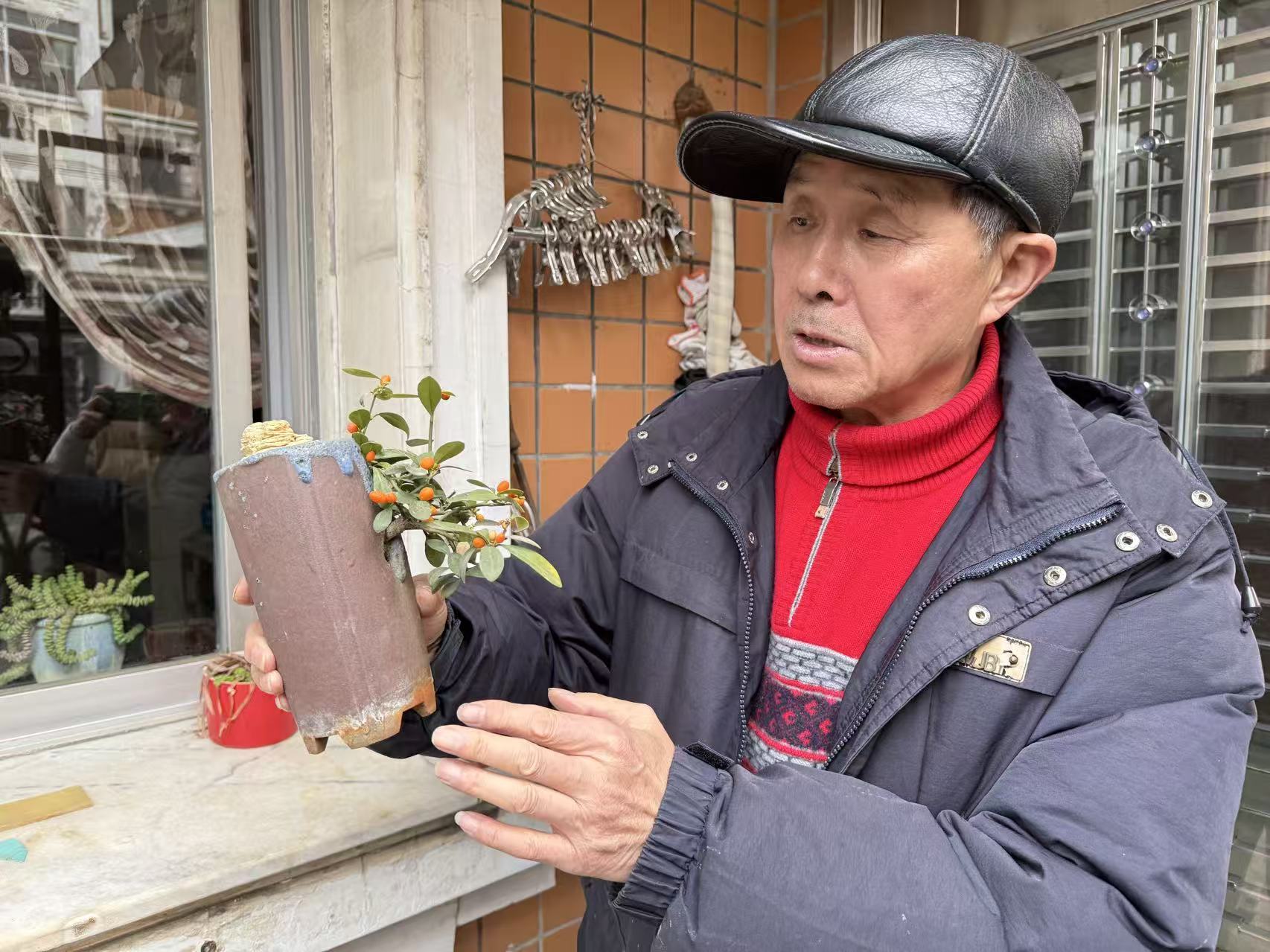 蒋海根能教居民养花,是因为自己就极度爱花。为了让记者看得更直观,蒋海根热情地带着记者去了他家门前。金粉典雅的茶梅、宛如小樱桃的冬青、暗香浮动的腊梅、虬枝舒展的罗汉松……他家住一楼,阳台内外错落有致地摆放着上百盆盆景,或苍劲挺拔,或温婉秀丽,每一盆都透着精心照料的痕迹。