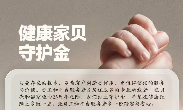 贝壳集团董事长彭永东在信中表示,“我和单总共同设立‘健康家贝守护金’,就是希望能多做一点,多保障一点,让服务者既能守护好小家,也能服务好千千万万个家,在一起奋斗的路上多一份踏实与安心。”