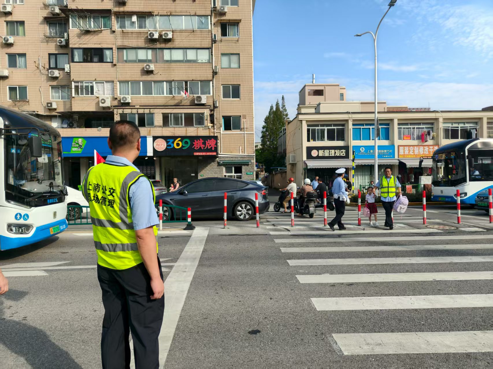 在校园门口,公交职工志愿者们构成了最美的风景线。开学首日,杨高公交的党员志愿者们走进金新小学开展了一场意义非凡的“开学日”护校活动,为学生们的新学期开启保驾护航。一大早,志愿者们早早来到校门口,身着整齐的志愿者服装,脸上洋溢着热情与关怀,随着学校周边的交通流量逐渐增大,车辆和行人往来愈加频繁,志愿者们迅速投入分工角色,在学校门口及周边主要交通路口,积极协助交警和学校安保人员疏导交通。他们熟练地指挥着车辆有序通行,引导家长和学生安全过马路,确保了校园周边交通的顺畅,有效避免了交通拥堵和安全事故的发生。清晨7点不到,身着“红马甲”、“公交蓝”志愿服的金高公交二分公司志愿者们早早到达博兴路模范中学、建平中学、沪新中学、高桥潼港小学、曹路龚华小学校门口,以饱满的热情和高度的责任感投入到护校工作中。在模范中学校门口,志愿者协助指挥交通。他们积极疏导过往车辆,提醒驾驶员减速慢行、礼让学生,有效缓解了学校周边的交通压力,保障了道路的畅通无阻。一位志愿者表示:“能够在开学之际为学生们的安全出行贡献一份力量,我们感到非常自豪”。