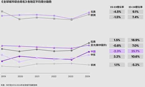 报告指出,城市的全球影响力及其与全球的连通更加多元、更加数字化,且在短时间内存在极大的不确定性。随着全球地缘政治和宏观经济格局的变迁,传统意义上的全球化进程持续减退,而全球城市的发展趋势预示着新一轮全球互联互通与交流浪潮的兴起。整体而言全球多数地区得分呈现不同程度的上升,扭转了前几年的下降趋势。从全球分地区得分变化来看,中国、拉美、中东地区涨势迅猛,实现10%以上的涨幅,北美、欧洲和亚太等地区得分微涨,而非洲地区呈现轻微跌势。