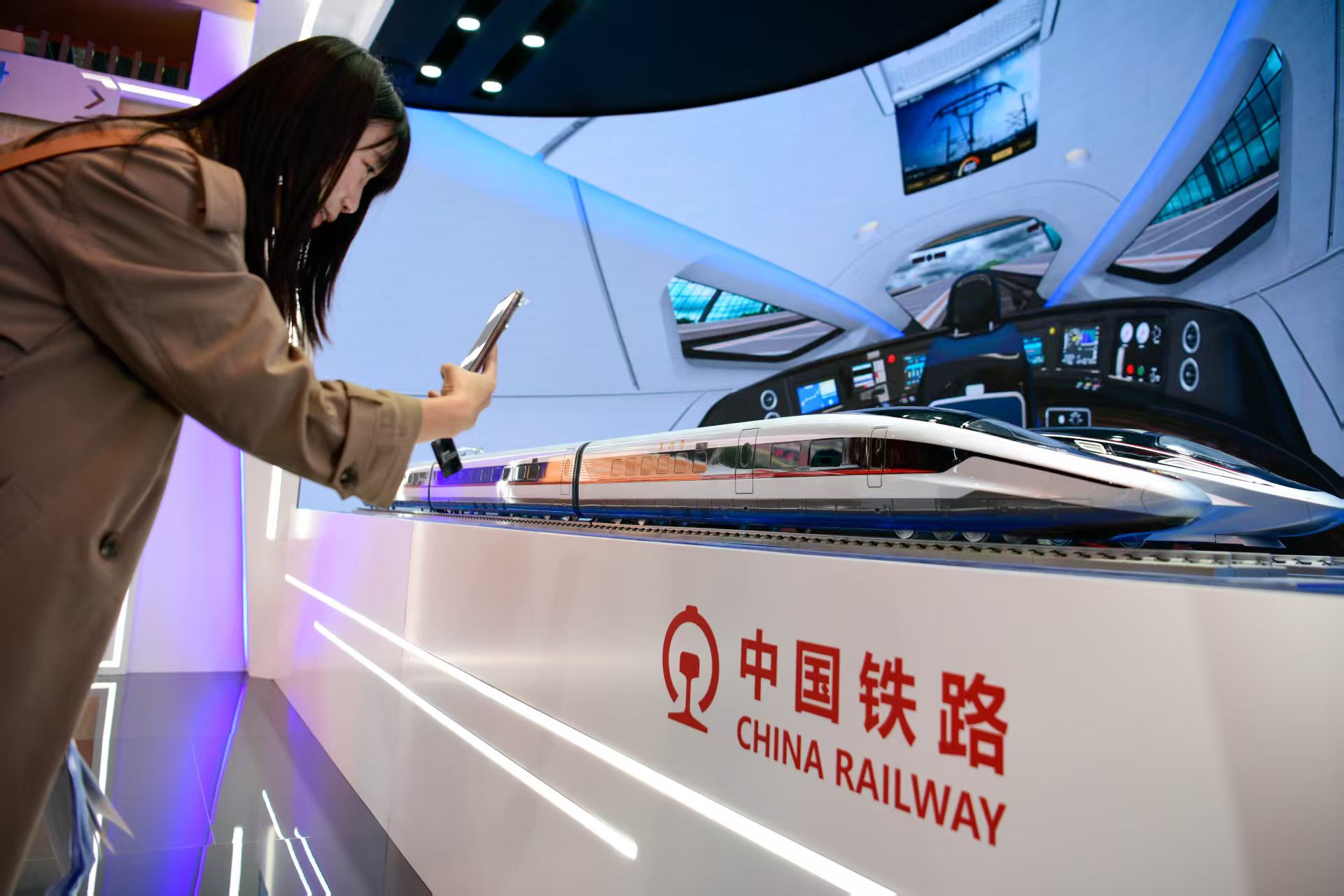 CR450动车组模型更是展示了最快高铁带来的中国速度。记者体验发现,参与者点击装置即可选择CR450沉浸式、试验场景仿真体验、车内漫游三种互动模式,时而在超大屏幕的包围下感受时速400公里的列车飞驰,时而全景游览最快高铁的车厢、驾驶室等多元空间,身临其境感受中国科技的硬核力量。