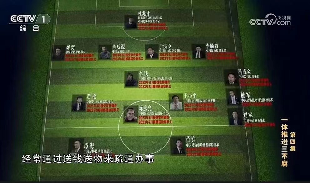 中国足协多达14名官员落网,央视排出了一个11人首发3人替补的阵容图。央视截屏