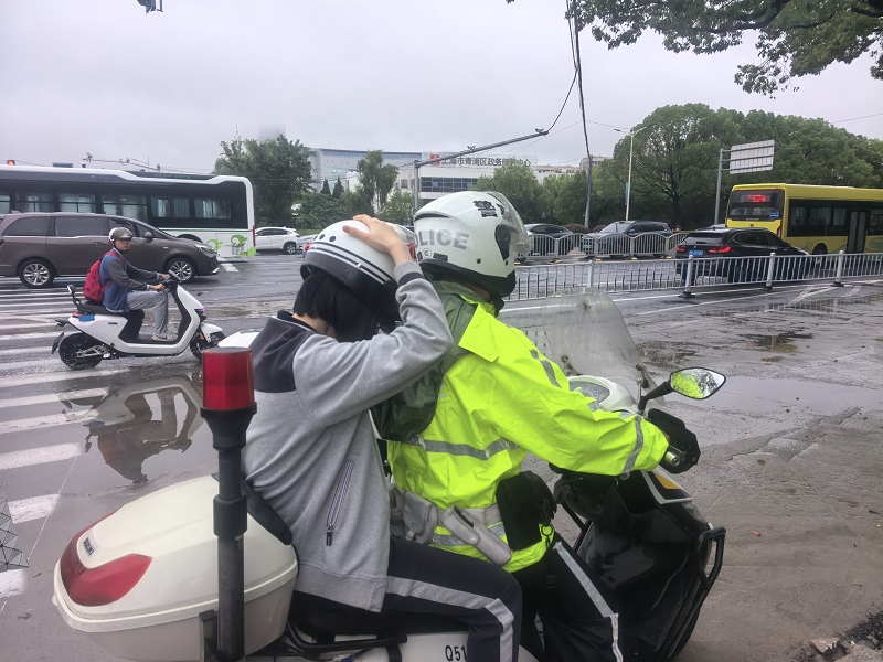 8点32分,青浦交管支队二大队民警张勇康在公园路外青松公路路口执勤时,接到一名考生家长求助,其驾驶小轿车带着女儿前往青浦高级中学考点参加高考,但由于早高峰又逢雨天行车缓慢。眼看考试时间临近,张勇康随即驾驶警用摩托将考生送至考点。原本10分钟的路程仅用时4分钟便安全抵达。