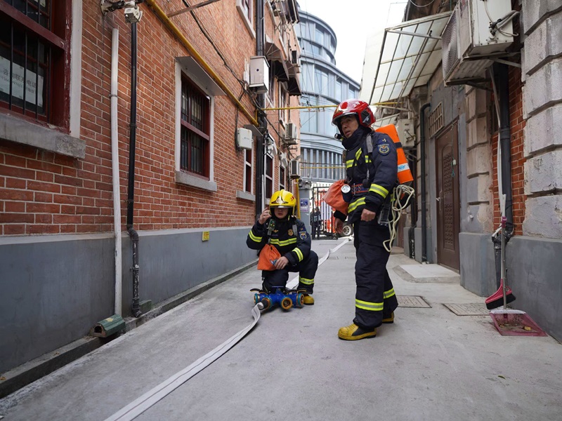 头图为消防人员正在居民区内展开日常训练。上海消防供图