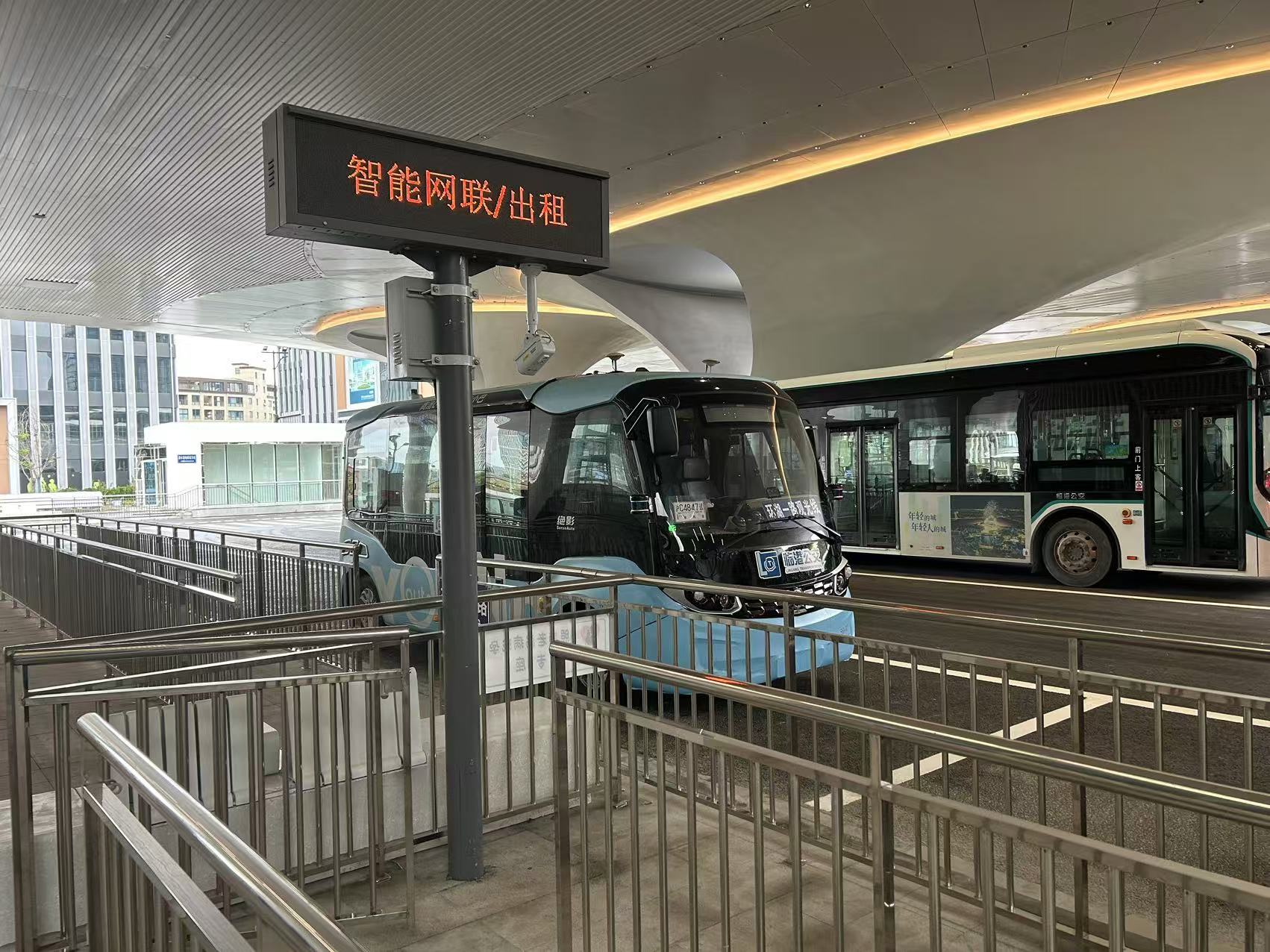 据悉,枢纽站共设置了五个公交候车站台。在靠近地铁出口的一个站台,一个标有“智能网联、出租”标识的区域十分醒目。