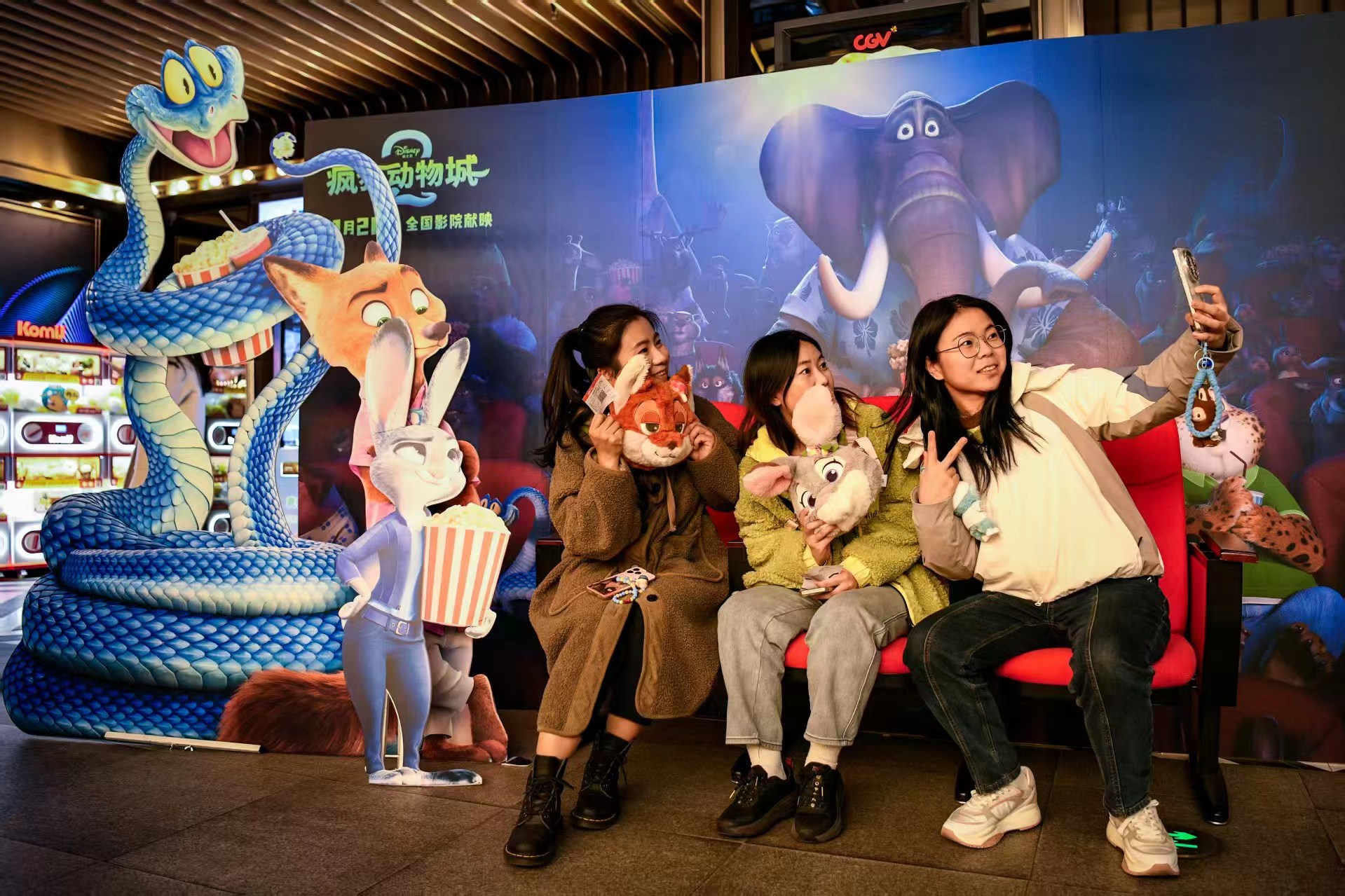 头图为前滩CGV影城内,观影在《疯狂动物城2》的主题展板前打卡拍照。劳动报记者颜筱依 摄影