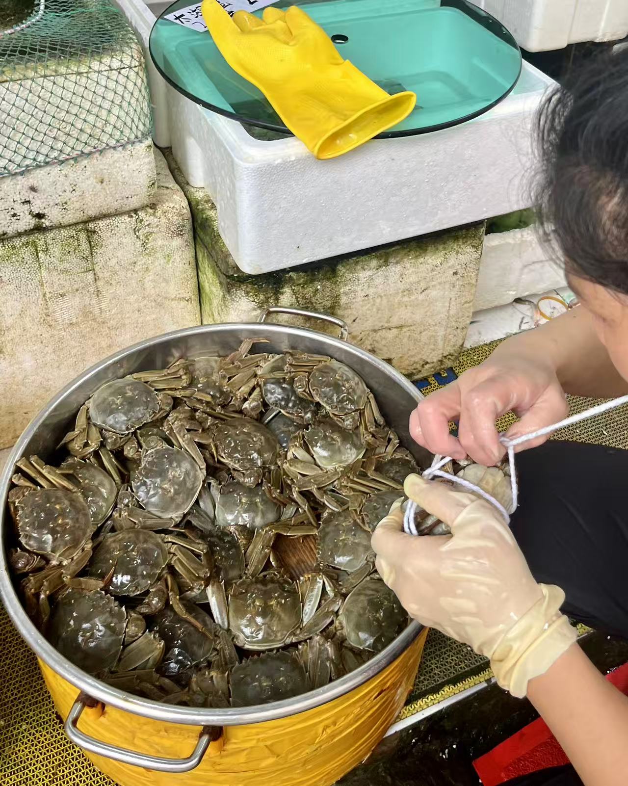 水产批发商正在扎蟹。劳动报记者贡俊祺 摄影