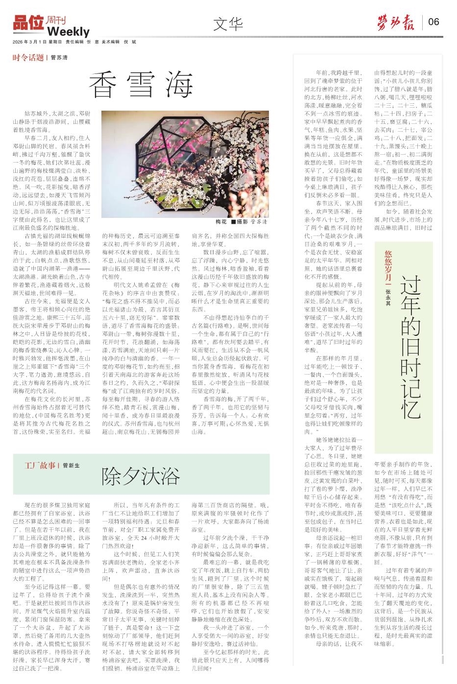 明代文人姚希孟曾在《梅花杂咏》的序言中由衷赞叹:“梅花之盛不得不推吴中,而必以光福诸山为最,若言其衍亘五六十里,窈无穷际”。寥寥数语,道尽了香雪海梅花的盛景:邓尉山一带,梅树弥漫数十里,花开时节,花浪翻涌,如海荡漾,若雪满地,天地间只剩一片纯净的白与清幽的香。一年一度的邓尉梅花节,如约而至,招引着天南海北的游客奔赴这场春日之约,久而久之,“邓尉探梅”成了江南独有的岁时风俗。每至梅开佳期,寻春的游人络绎不绝,踏青石板,赏漫山梅,闻十里香,成为春日里最浪漫的仪式。苏州香雪海,也与杭州超山、南京梅花山、无锡梅园并肩齐名,并称全国四大探梅胜地,享誉华夏。