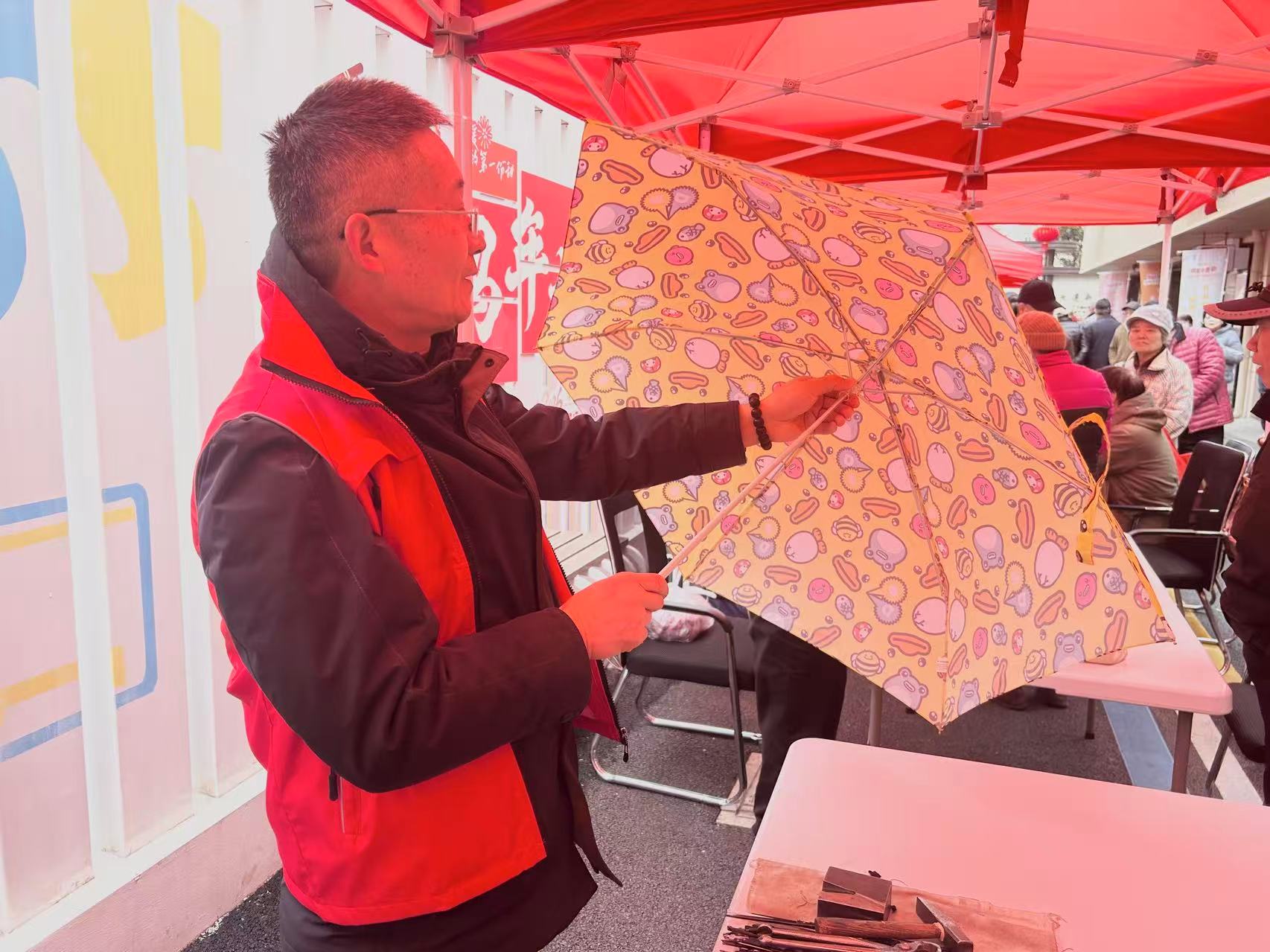 另一边的便民服务摊位同样忙碌。理发、修伞、织补、修拉链等颇受欢迎。尤其是修伞摊位前,一把把“带病上岗”的雨伞排起了队。连日阴雨让雨伞成了出门必备,不少居民把家里伞骨歪了、卡扣松了的旧伞带来“抢修”。志愿者熟练地拆装、校正,不一会儿,一把把旧伞重新撑开。